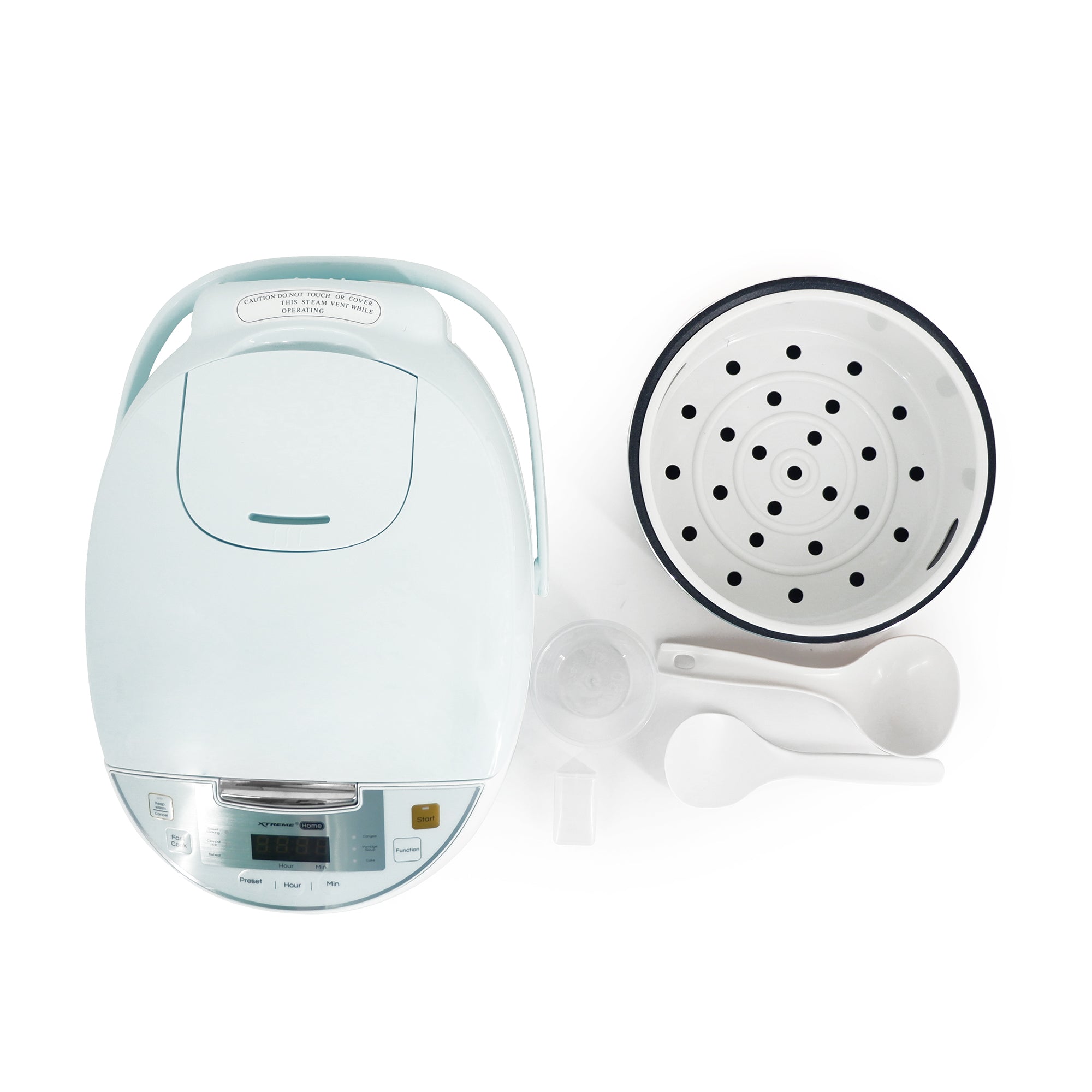 *Easy to read LED digital *T1.7mm inner pot with non-stick coating *24 hours present timer *Automatic keep warm function *Removable large steam ventilation *230V~ 60Hz voltage *600W rated power *Product Dimension (WxDxL): 330x245x198 *Color: Mint Green *3.3kg gross weight *2.8kg net weight ACCESSORIES: Scoop Measuring Cup Food Steamer
